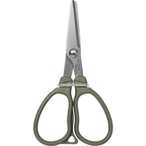 Ножиці DaiichiSeiko MC Scissors 25 - легкий і компактний інструмент для перерізання дуже тонкого шнура. Гострі леза з зубчиками на одній стороні виконані з високоякісної нержавіючої сталі. На ручці передбачена силіконова резинка, яка запобігає довільному відкриттю ножиць, під час використання знімати накладку не потрібно. Зверху на ручці розташований гачок, за допомогою якого ножиці можна підчепити на карабін до решти інструментів.