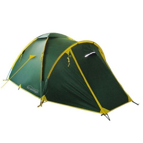 Універсальна тримісна туристичсекая намет Tramp SPACE 3 (V2) з зовнішнім розташуванням каркаса і просторим тамбуром. Три зовнішні дуги забезпечують високу стійкість до намету вітру і дощу. Перевага використання в конструкції намету зовнішніх дуг: зручність установки під час дощу (спочатку ставитися тент, а потім під прикриттям внутрішній намет пристібається, яка залишається суху). Можливість значно швидше складати і ставити суху намет — досить дістати (або ввести) дуги в кишені на тенті. Конструкція намету більш вітростійка, ніж класичний намет з дугами "всередині", за рахунок більш сильного натягування тенту і жорсткої фіксації дуг. Зовнішні дуги сильніше натягують зовнішній тент, за рахунок чого конденсат швидше скочується по його внутрішній поверхні, не затікає в спальний відсік. Завдяки вешнему розташуванню дуг простір між кулями намети стає більше за рахунок чого поліпшується вентиляція і знижується кількість конденсату.