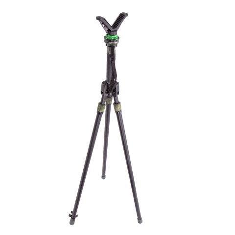 Тренога Fiery Deer Tripod Trigger stick — очень полезная вещь для охотника. Достаточно одного нажатия на рычаг, чтобы выставить необходимую высоту и наклон сошек. Высота сошек регулируется в диапазоне от 90 до 165 см, увеличив угол раскрытия ножек треноги можно уменьшить высоту подставки до 60 см. Этот диапазон регулировок позволяет охотнику стрелять сидя, с колена и стоя.