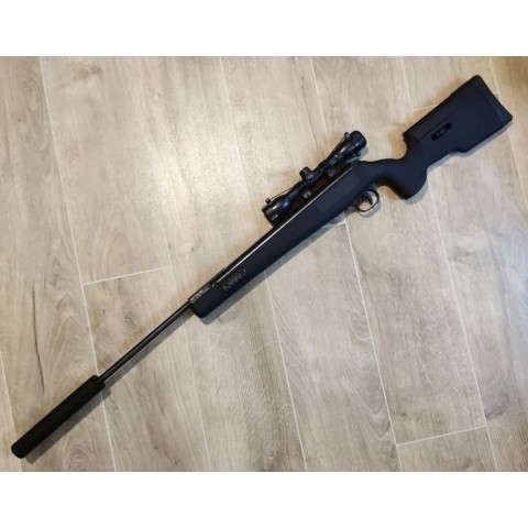 Гвинтівка з гарною газовою пружиною та в стані нової, настріл – буквально пара пострілів. Дуже сильна. Було довстановлено приціл Center Point 4x32.