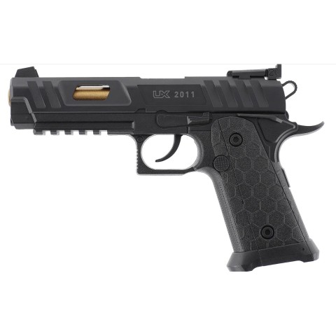 Umarex UX 2011 — це сучасна версія класичного Colt 1911. Пневматичний пістолет вирізняється агресивним дизайном: золотистий ствол, руків’я з великими шестигранними насічками — усе це підкреслює спортивний характер моделі. Umarex UX 2011 — це пневматичний пістолет на CO₂ з нерухомим затвором (NBB). Він відзначається простою та надійною конструкцією, полімерним корпусом і використовує сталеві кульки BB калібру 4,5 мм. Легка вага, зручність у користуванні та непогана початкова швидкість — близько 130 м/с — роблять його чудовим варіантом для розважальної стрільби (плінкінгу). Пістолет оснащений ручним запобіжником і планкою Picatinny для встановлення аксесуарів.