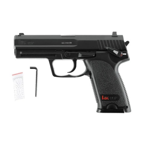 Umarex HK USP – це страйкбольна копія бойового прототипу, яка поєднує в собі приємне співвідношення ціни і якості. Візуально пістолет повторює всі риси і лінії оригіналу. Та на відміну від оригіналу, репліка працює від балона СО2, який розташований в магазині, і стріляє кульками. Магазин вміщує 16 куль ВВ 6 мм.