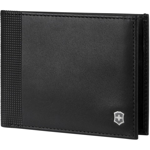 Victorinox Travel ALTIUS ALOX Slim (Black) – тонкий шкіряний гаманець зі слотами для карток та відділенням для паперових грошей. Класичний чоловічий дизайн у чорному кольорі з металевим шильдом-логотипом Victorinox та RFID-захистом. Деталізація підкреслена чіткою естетикою рифлених алюмінієвих накладок кишенькових ножів із колекції Alox.