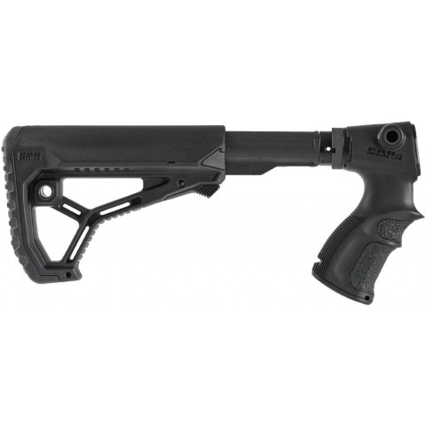 Інформація про приклад FAB Defense М4 для Remington 870Труба приклада виготовлена з алюмінію, приклад виготовлений з ударостійкого текстурованого пластику. Потиличник приклада - відкидний гумовий з великою текстурою. На прикладі є кріплення під збройовий ремінь і швидкознімну антабку. Пістолетне руків'я має спеціальну текстуру, що запобігає ковзанню руки стрільця навіть у погану погоду.