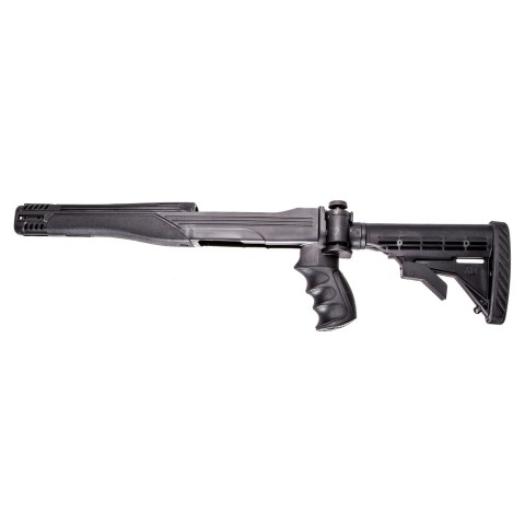 Приклад складывающийся регулируемый по длине 6 позиций. Удобный съемный и не скользящий резиновый затыльник (Scorpion Buttpad - система гашения отдачи в руку (накладка на пистолетную рукоять) и плечо (затыльник)). Можно вести огонь из сложенного положения. Новый механизм складывания приклада, энергия отдачи поглощается при стрельбе патронами калибра магнум 12/76 и более. Отдача от выстрела надежно поглощается, стрельба производится без болевых ощущений от отдачи. Поглощение отдачи минимизирует подъем ствола от выстрела, что снижает необходимость повторного прицеливания, повышает эффективность пружинных и поршневых систем погашения отдачи. Не поддается воздействию перепада температур, на корпусе не остаются царапины. Цвет черный. Производство США, подходит на все карабины Ruger 10/22.