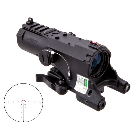 Быстросъёмный, 4-х кратный коллиматорный прицел. Устанавливается на стандартную планку вивера. В передней части прицела встроен лазерный целеуказатель (зеленый) и светодиод для подсветки ближайших целей (красный/ белый). На верхней части прицела установлены запасные целик и мушка, посадочное место для коллиматорного прицела Micro Dot и планка вивера. Сетка URBAN TACTICAL– цвет подсветки голубой.