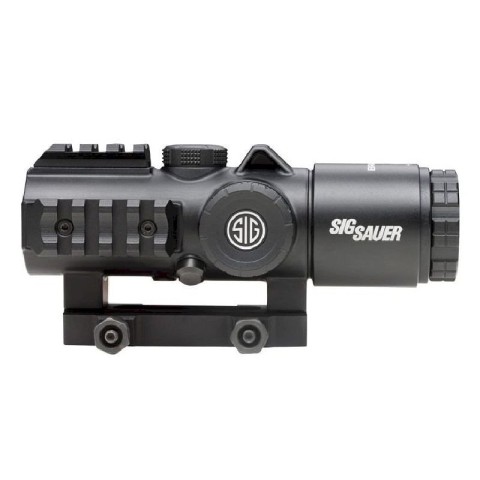 SIG Sauer BRAVO3 має радикально новий дизайн для професійних та цивільних AR-стрільців. Приціл забезпечує найкраще у галузі поле зору, яке на 43% ширше, ніж у поточних бойових прицілів. Неймовірно плоске зображення без спотворень може похвалитися безпрецедентною чіткістю завдяки поєднанню скла з низькою дисперсією (LD) та конструкцією асферичних лінз. Легкий і водночас міцний магнієвий корпус має вбудовані планки Пікатінні з 3-х сторін для додаткових аксесуарів, таких як ліхтарі та лазери. BRAVO3 розроблений з висотою 39 мм від верхньої частини планки Пікатінні M1913 до центральної осі об'єктива для сумісності з приладом нічного бачення.