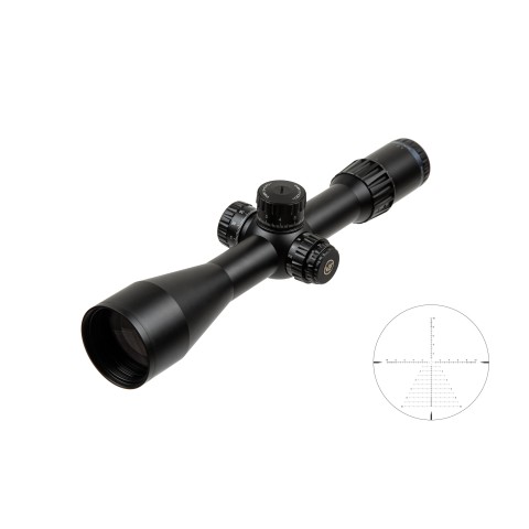 Прицільна сітка: Сітка розташована у другій фокальній площині (SFP), що означає, що її розмір не змінюється при зміні збільшення. Це забезпечує постійну точність при будь-якій кратності. На кратності 16х приціл дозволяє правильно вимірювати дистанцію до об’єктів, розмір яких відомий. Сітка VTA-6 в MIL полегшує прорахунок завдяки метричній системі, а також дозволяє робити постріли «виносом» завдяки деревовидній структурі.