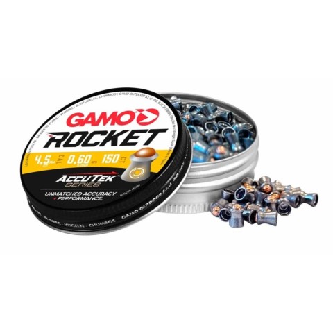 Gamo Rocket AccuTek™— пневматичні кулі з технологієюAccuTek™для підвищеної точності та стабільної траєкторії. Свинцеве тіло зі сталевою кулькою в головній частині забезпечує високу пробивну силу та захист нарізів ствола. Ідеальні для точної та результативної стрілянини.