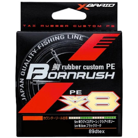 Шнур YGK X-Braid Bornrush WX8 є високотехнологічним продуктом іменитої японської компанії, розроблений з урахуванням особливостей морської риболовлі. Безумовно, моделі лінійки чудово підходять і для прісноводного лову. 8-ми жильна структура з плетінням за фірмовою технологією HST.WX забезпечує неймовірну гладкість і м’якість при суттєвій міцності та невеликому діаметрі. Мінімальна розтяжність плетінки сприяє винятковій чутливості та дуже ефективному підсіканню. Для безперервного контролю дистанції до приманки на всю довжину шнура нанесено спеціальне маркування кількома кольорами на послідовних ділянках шнура. Діапазон розривних навантажень модельного ряду дозволяє використовувати снасті класів потужності від Medium Light до Medium Heavy. Випускається у розмотках 200, 300 та 400 метрів, що дозволяє розділити вміст бобіни на кілька котушок. Шнур YGK X-Braid Bornrush WX8, як і багато аналогічних продуктів YGK, пропонує одне з найкращих у світі співвідношень невеликого діаметру, високої міцності та зносостійкості.