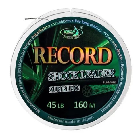 Шоклідер Katran Record Braided Shock-Leader запобігає обриву основної волосіні при силових закиданнях важких вантажів. Застосовується переважно в коропової чи морської риболовлі. Являє собою плетений шнур з 8 ниток, що виконанні з волокон матеріалу японського походження UHMWPE (високомодульний поліетилен). Завдяки спеціальній схемі плетіння виробнику вдалося досягти виняткової гладкості зовнішньої поверхні та практично ідеально круглого перерізу. Все це в комплексі із особливими характеристиками матеріалу сприяє суттєвій міцності, малій пам’яті та абразивній стійкості. Модельний ряд Katran Record Braided Shock-Leader складають варіанти з розривними навантаженнями 45 та 60 фунтів та кількома довжинами розмотування. Модель з розмотуванням 160 м є версією, що тоне, всі інші - плаваючі.