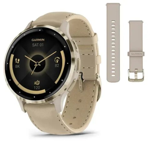 Смарт-годинник Garmin Venu 3s французький сірий із золотистим сталевим безелем і шкіряним ремінцем