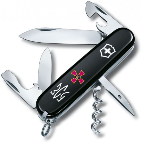 Швейцарський складаний ніж 91 мм на 12 функцій з патріотичної колекції SPARTAN ARMY. Чорні глянцеві накладки з якісним друком емблеми Збройних сил України та тризубом, стилізованим під абревіатуру ЗСУ. Відмінний тандем, адже саме чорні накладки були автентичними для перших складних ножів Victorinox.