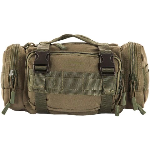Сітчаста кишеня в основному відсіку і система кишеньок у меншому (фронтальному відсіку) дають змогу зручно розмістити всі ваші аксесуари. Сумочка оснащена і двома невеликими бічними кишеньками (під мультитул або інші дрібнички). Конструкція дає змогу заховати лямки і підвісити сумочку на систему MOLLE (рюкзак, РПС, жилет і тд). Зверху є зручна ручка для перенесення. Поясний ремінь підійде для талій до 115 см в обхваті.