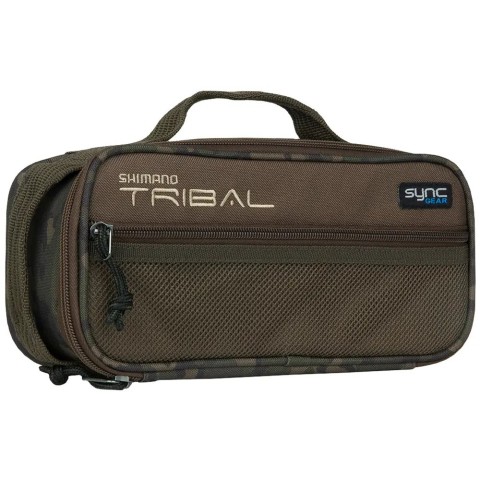 Сумка Shimano Sync Hookbait Case відноситься до серії коропових аксесуарів виробника, що випускаються під торговою маркою Tribal Sync Gear. Вона призначена для перенесення набору коропових насадок - бойлів або пелет в спеціальних баночках, які в кількості 6 штук йдуть із нею в комплекті. Внутрішній простір сумки розділений перегородками на три відсіки, що виключає перекочування вмісту під час пересування. Плоска зовнішня кишеня на передній панелі можна використовувати для зберігання оснащень або невеликих пакетиків із штучними приманками. Сумка виконана з довговічних синтетичних матеріалів і оснащена надійними блискавками, які не підведуть під час користування. Для перенесення в верхній частині і на бічній панелі є плоскі ручки.