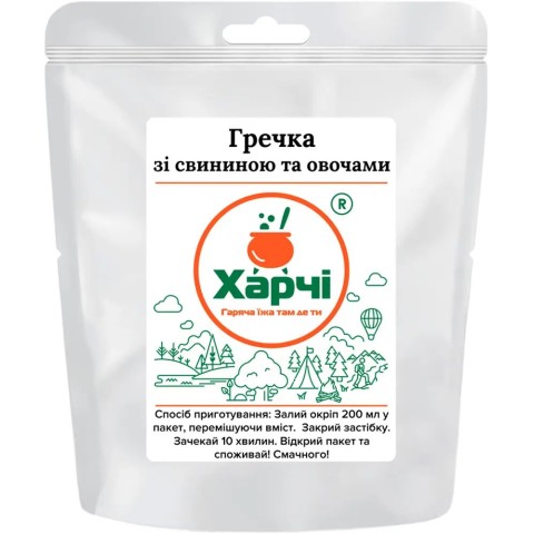 Склад: гречка пропарена, сушена (75%), сушені: варена свинина (12%), цибуля, морква, сіль.