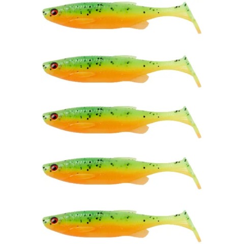Силікон Savage Gear Fat Minnow T-Tail – віброхвіст з дуже реалістичними формами та кольорами. Дрібна деталізація всіх особливостей натуральної рибки, аж до фактури та 3D очей, робить схожість цієї приманки з натуральним мальком практично бездоганною. Тонка хвостова частина, яка переходить у класичну п’яту, забезпечує хорошу рухливість приманки при проводці. У виробництві силіконових віброхвостів Savage Gear Fat Minnow T-Tail присутні фази ручних операцій при фарбуванні, завдяки чому кожна приманка набуває неповторної індивідуальності. Використання флуоресцентних барвників забезпечує хорошу помітність приманки, у тому числі під дією ультрафіолетових променів на великій глибині. Наявність у складі матеріалу атрактанту стимулює апетит у риби. Модельний ряд включає близько 10-ти колірних варіацій у 4-х розмірах: 75, 90, 105 та 130 міліметрів.