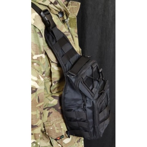 Універсальна, міцна сумка із сучасного матеріалу та з 3 кишенями на змійці для зберігання різних тактичних аксесуарів. У великому відділенні є додатковий внутрішній відсік. Система MOLLE спереду та збоку. Сумка на будь-яке плече, є липучка під патч. Виготовляється в 3-х кольорах: чорний, олива та піксель.