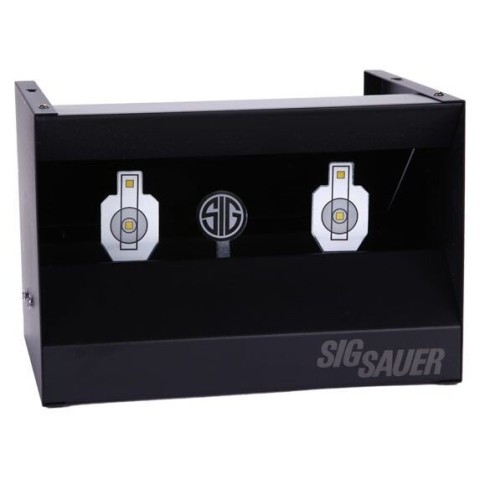 Тир SIG AIRGUN DUAL SHOOTING GALLERY являє собою сталевий кулеуловлювач з двома мішенями, що падають, і центральною мішенню Sig з функцією скидання. У комплекті п'ять наборів змінних наклейок-мішеней. Рекомендується для використання тільки зі свинцевими кулями пневматичної зброї та свинцевим дробом. Не для використання сталевих BB. Потужність обмежена 16 джоулів.