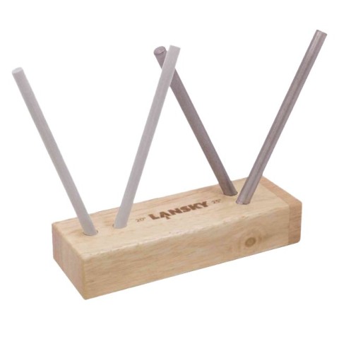 Одна або декілька пар отворів свердлити в дерев'яному бруску під різними кутами відносно один одного. Після цього пара точильних каменів може бути встановлена у відповідну пару отворів – і можна здійснювати заточку! Після закінчення роботи точильні камені можуть бути прибрані – брусок-основа має відсік для зберігання точильних каменів.