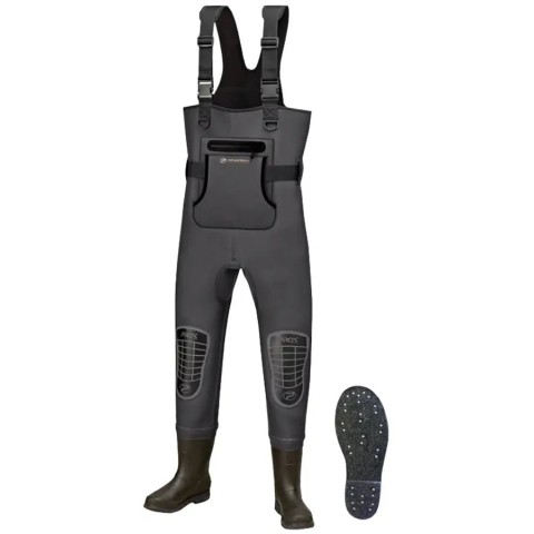 Вейдерси Prox 3D Inner Chloroprene Wader мають теплозберігаючий ефект, тому підійдуть для використання в холодній воді навесні і восени. Вони виконані з матеріалу W2 - хлоропрену (різновид неопрена) з зігріваючою флісовою підкладкою. Завдяки такій структурі, рибалка може тривалий час перебувати у воді і не відчувати дискомфорту, пов’язаного з холодом. У нижній частині знаходяться чоботи з еластичного ПВХ, підошва яких виконана з повсті із вмонтованими шипами, що забезпечують надійне зчеплення практично на будь-яких поверхнях. Вейдерси оснащені двома зовнішніми кишенями - одна з водонепроникною блискавкою для зберігання речей, а друга відкрита для зігрівання рук. Регульовані шлейки з застібками дозволяють зручно підлаштувати розмір під свої параметри, щоб вони не сковували рухів. На колінах передбачені армовані вставки, що захищають основний матеріал від пошкоджень.