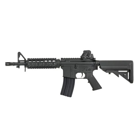 Cyma CM.002 — надійна і якісна репліка на платформі AR-15, створена для динамічних боїв у приміщеннях і впевненої роботи на ближніх і середніх дистанціях. Укорочений ствол робить гвинтівку маневреною, а поєднання алюмінієвої ствольної коробки і ударостійкого ABS-полімеру у фурнітурі забезпечує міцність при помірній вазі. В комплекті присутній подовжувач зовнішнього ствола. Передня алюмінієва цівка з рейками Пікатінні дозволяє швидко встановлювати тактичні аксесуари, а всі металеві деталі мають антикорозійне покриття і виготовлені з якісного сплаву для довговічності. Телескопічний приклад з міцного полімеру зручний у використанні, полегшує транспортування і одночасно призначений для розміщення акумулятора. Вбудована регульована система Hop-Up дає можливість точно налаштувати траєкторію BB-куль, а металевий гірбокс V2 гарантує стабільну роботу механіки і відкриває простір для майбутніх апгрейдів. Гвинтівка поставляється в чорному виконанні і комплектується акумулятором і бункерним магазином - готова до гри відразу після отримання.