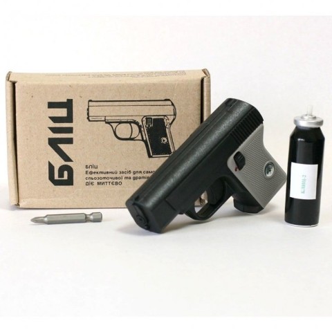 Інформація про виріб "Бліц" (комплект)Призначений для використання цивільними особами як засіб самозахисту і являє собою пластмасовий корпус у вигляді пістолета з двома взаємозамінними балонами - аерозольного і струминного типу. Балони заповнені препаратом, що містить речовину сльозоточивої та подразнювальної дії (іритант) - морфолід пеларгонової кислоти.