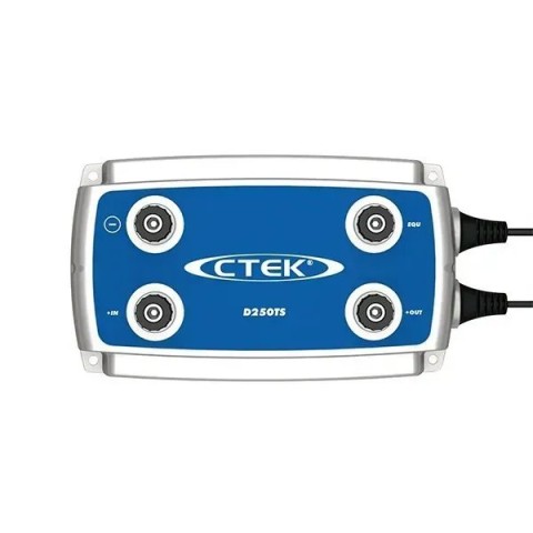 CTEK D250TS повністю автоматизований 4-етапний зарядний пристрій, що забезпечує зарядний струм 10А для батарей 24V від 28Аh до 200Аh. Використовується для зарядки АКБ свинцево-кислотного типу, забезпечує автоматичне розділення блоків на окремі компоненти. Пристрій забезпечує підтримку заряду протягом 10 днів, а також підвищений рівень ККД.