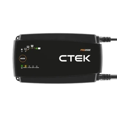 CTEK PRO25SE - це представник нового покоління сучасних зарядних пристроїв та засобів підтримки стану акумуляторної батареї, оновлення моделі MXS 25, розроблений спеціально для потреб сучасних автомайстерень, в яких здійснюється ремонт автомобілів, що оснащуються 12-вольтовими акумуляторами. Витрати зворотного струму менш ніж 2Ah на місяць*. Пристрій виробляє струм з коливаннями напруги не більше 4%**.